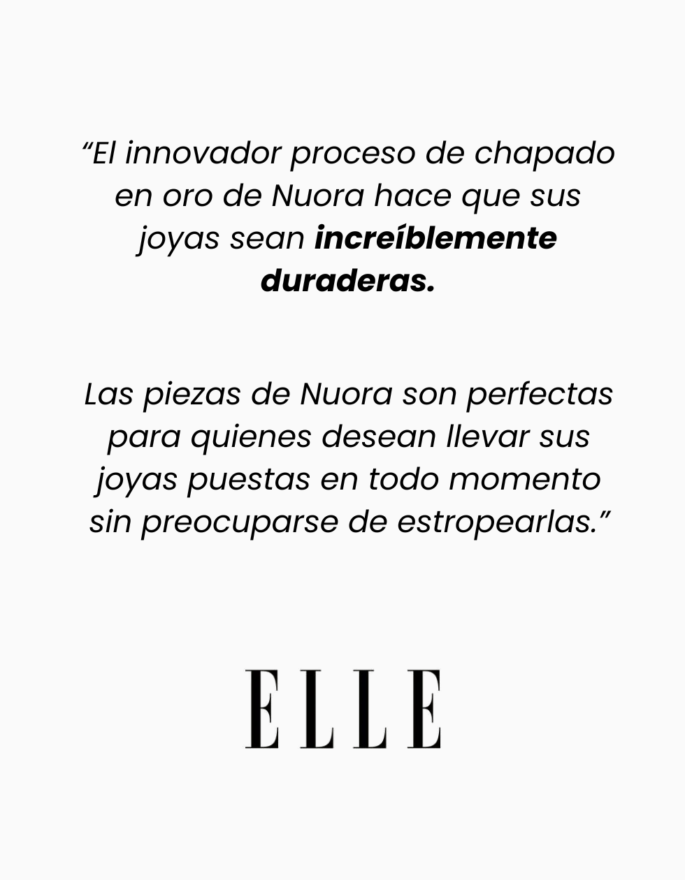 Todas las piezas de Nuora son resistentes al agua, al sudor, hipoalergénicas, no se empañan y son aptas para el uso de cosméticos.
